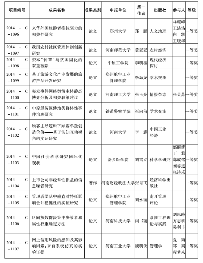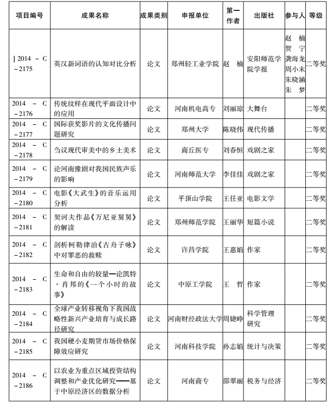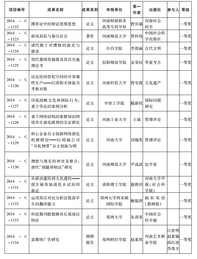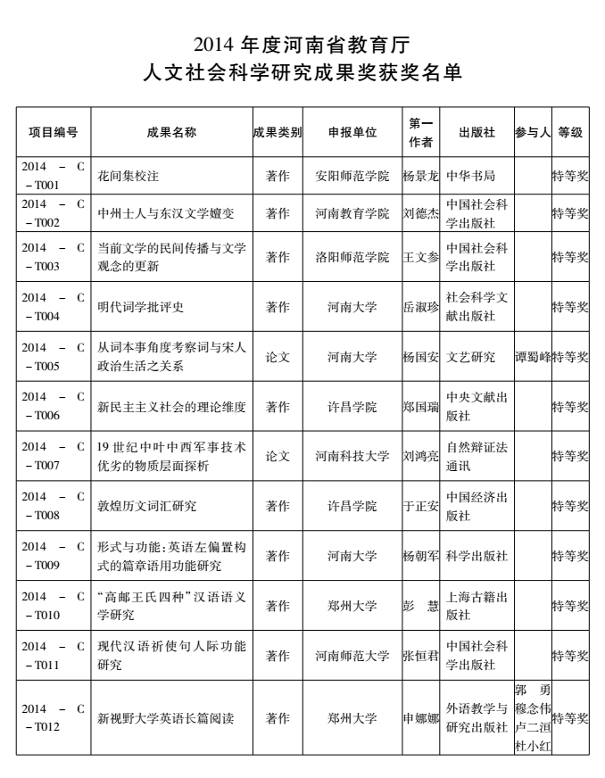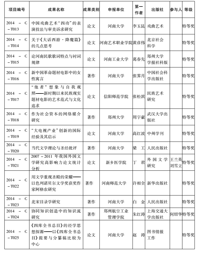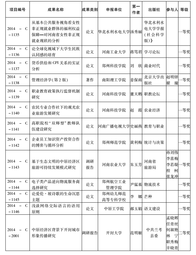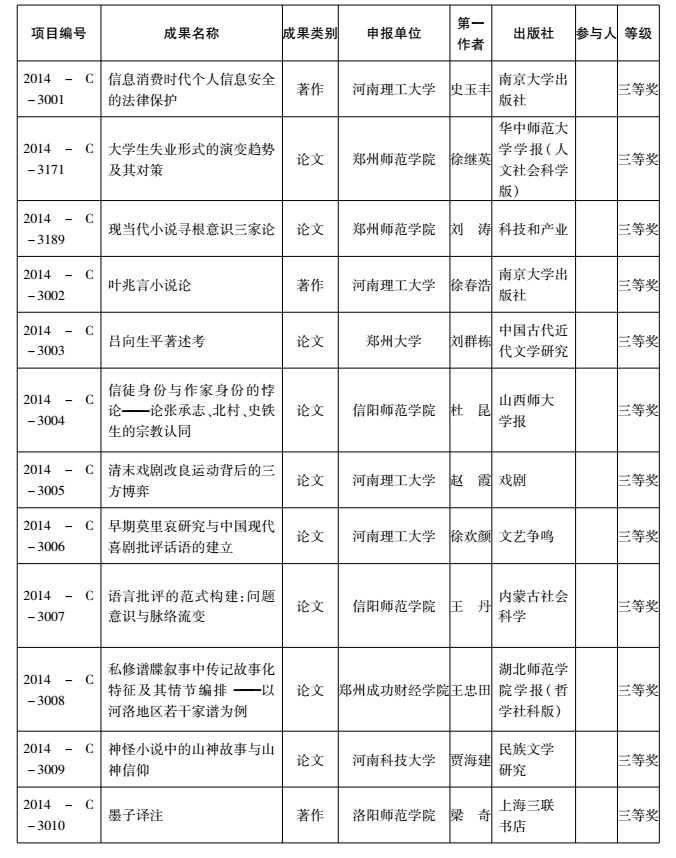 2014年度河南省教育厅人文社会科学研究成果奖获奖名单